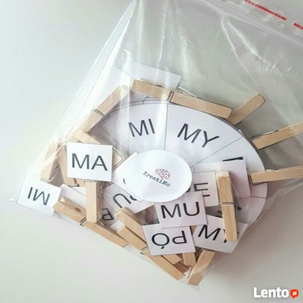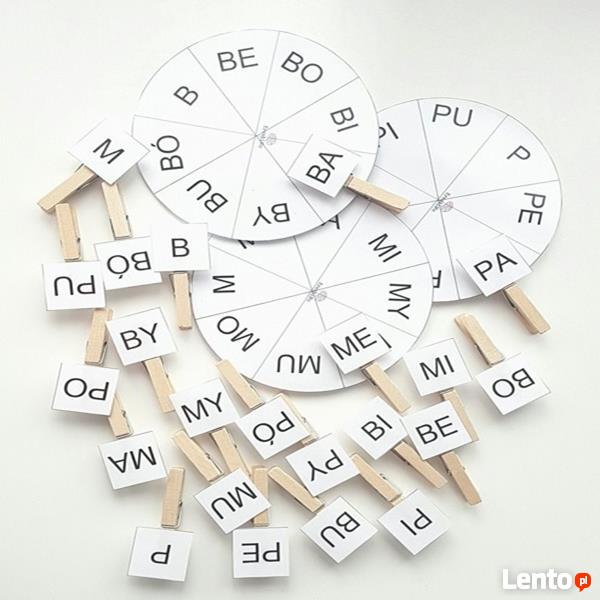 Cena dotyczy zestawu 3 kół na każdym 7 sylab i głoska (p,b lub m) + 24 klamerek z sylabami.