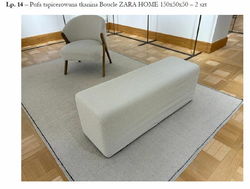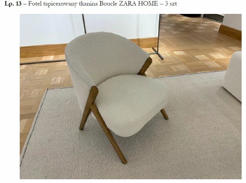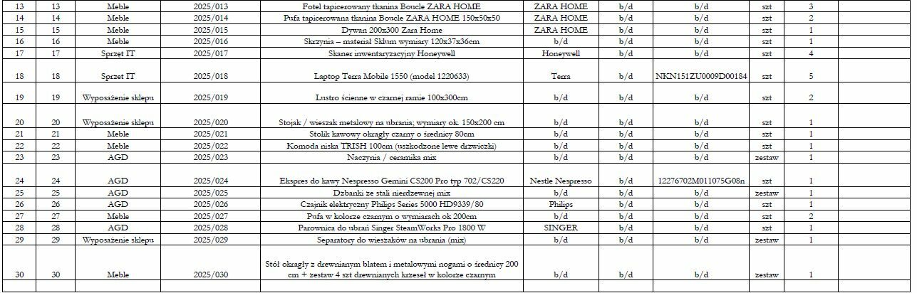 Zbiór ruchomości stanowiących wyposażenie sklepu odzieżowego w postaci mebli, sprzętu RTV, sprzętu AGD, szczegółowo opisany w Oszacowaniu wartości ruchomości autorstwa Andrzeja Jakubaszka. Dokładny spis ruchomości podlegających sprzedaży można uzyskać kontaktując się z biurem Syndyka.