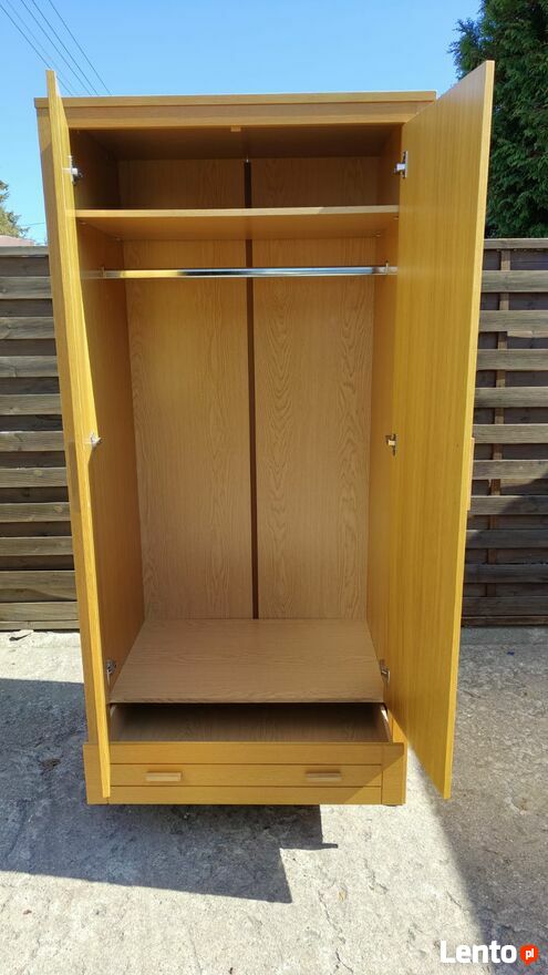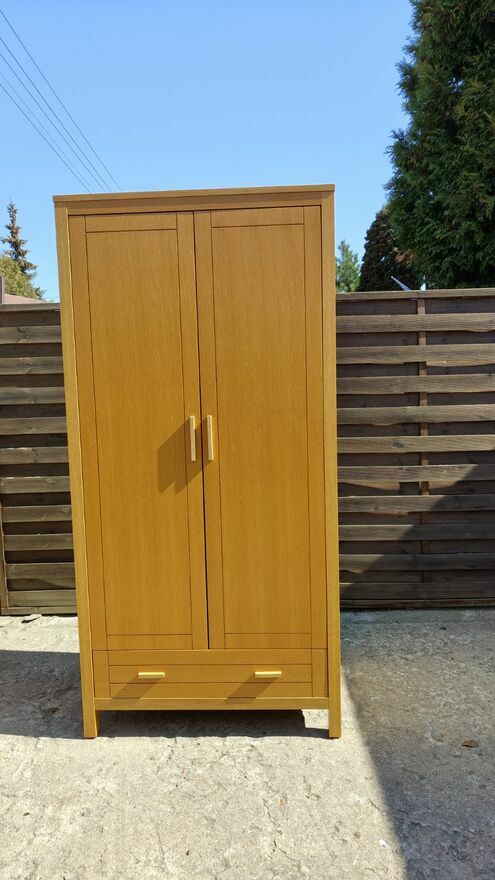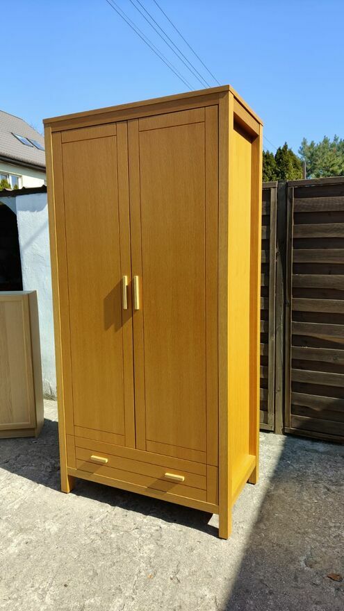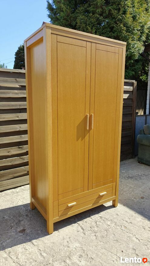 PROMOCJA GRUDNIOWASolidna, pojemna szafa 2-drzwiowa z drążkiem na wieszaki i szufladą na dole. Wykonana z drewna dębowego oraz płyty fornirowanej. Doskonała do sypialni, przedpokoju czy pokoju dziecka.