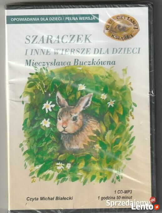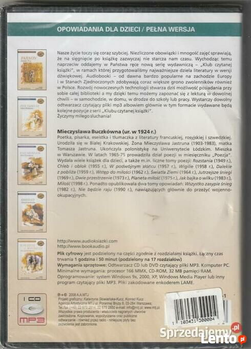 OPOWIADANIA DLA DZIECI / PEŁNA WERSJA Poetka, pisarka, eseistka i tłumaczka z literatury francuskiej, rosyjskiej i szwedzkiej. Urodziła się w Białej Krakowskiej. Żona Mieczysława Jastruna (1903-1983), matka Tomasza Jastruna. Ukończyła polonistykę na Uniwersytecie Łódzkim. Mieszka w Warszawie. W latach 1965-75 prowadziła dział poezji w miesięczniku „Poezja". Wydała wiele książek dla dzieci, a także m.in. liczne tomy poezji: Rozstania (1949 r.), Chleb i oblok (1955 r.), W podwójnym słońcu (1957 r.), Wigilie (1958 r.), Dalekie z pobliża (1959 r.), Wstęp do miłości (1962 r.), Światła Ziemi (1964 r.), Jutrzejsze śniegi (1969 r.), Dwie przestrzenie (1973 r.), Planeta miłość (1975 r.), Jak bajka o wilku (1983 r.), Miłość (1998 r.). Ponadto opublikowała dwa tomy opowiadań: Wszystko zasypie śnieg (1982 r.), Nie będzie raju (1990 r.), nawiązujących głównie do przeżyć wojenno- okupacyjnych. Plik cyfrowy jest podzielony na części zgodnie z rozdziałami książki. Łączny czas trwania 1 godzina i 50 minut (podzielony na 17 rozdziałów) Wymagania sprzętowe: Odtwarzacz CD lub DVD czytający pliki MP3. Komputer PC. Minimalne wymagania: procesor 166 MMX, CD-ROM, 32 MB pamięci RAM. Oprogramowanie: system Windows 9x, 2000, XP, Windows Media Player lub inny program czytający pliki MP3. Pliki zakodowane enkoderem LAME. + 2008 A.AMTJ Żartobliwa, rymowana bajeczka dla najmłodszych o przygodach małego szaraczka i jego leśnych przyjaciół, Karton 83 Ogłoszenie jest aktualne dopóki znajduje się na stronie . Odbiór osobisty lub wysyłkaSprawdź zainteresowanie tym ogłoszeniem