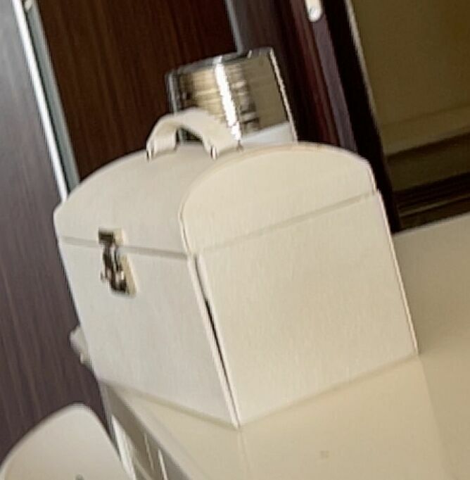 Stan uczciwie — szkatułka jest używana od dłuższego czasu. Lusterko ma widoczne ślady zużycia na powłoce, obicie z ekoskóry nosi ślady czasu. Całość wymaga odświeżenia i przetarcia. Wszystkie szufladki działają bez problemu, zatrzask zamyka się poprawnie.