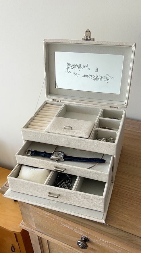 Szkatułka na biżuterię w kolorze kremowym, z trzema poziomami przechowywania i dwoma wysuwnymi szufladami. W pokrywie zamontowane lusterko.Pudełko ma przegródki na pierścionki (rowkowane wkładki), osobne komory na kolczyki, wisiorki i bransoletki. Wymiary około 13 × 21 cm — kompaktowe, ale całkiem pojemne.