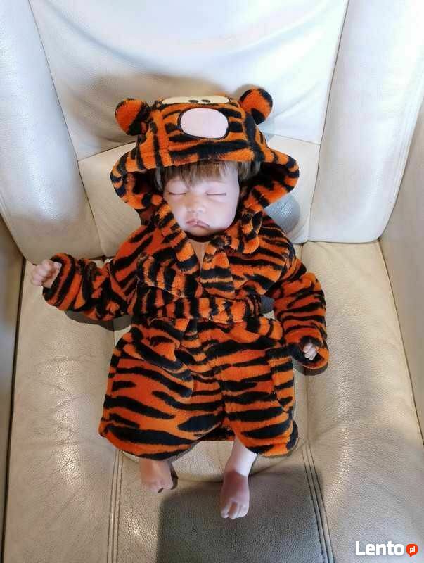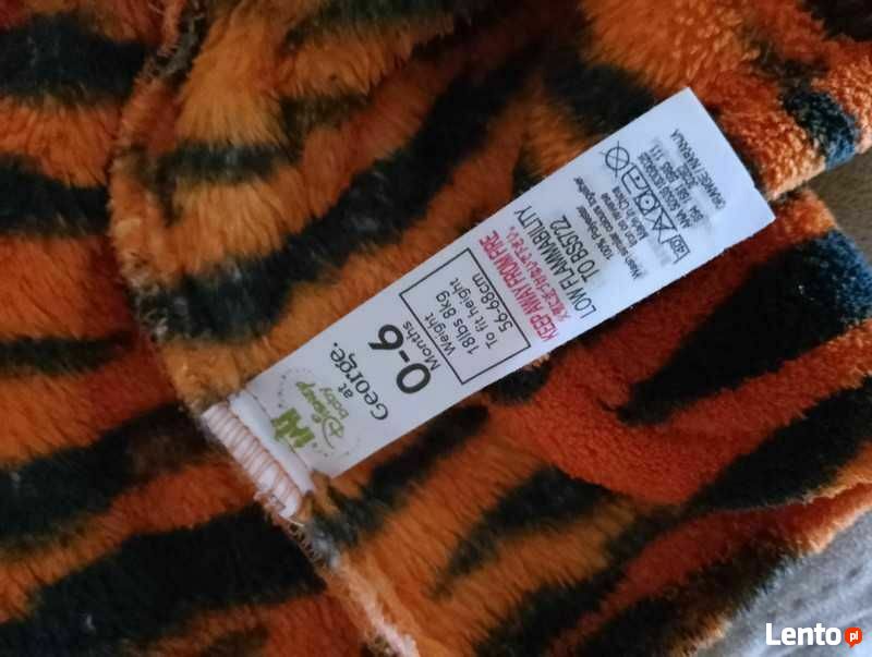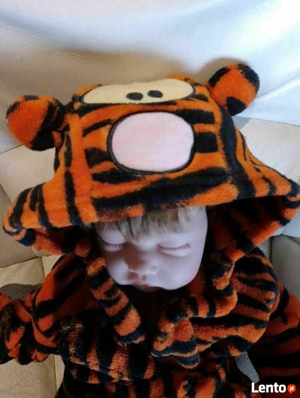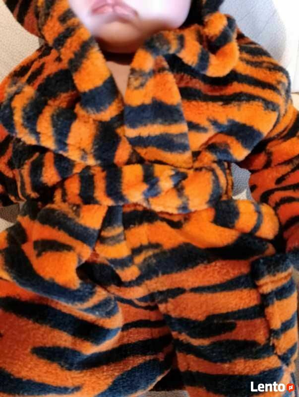 Sprzedaję uroczy szlafrok niemowlęcy marki George – w motywie tygrysa, w kolorze pomarańczowo-czarnym, rozmiar 62–68 cm / 3–6 miesięcy Stan określony jako bardzo dobry – bez plam, przetarć, miękki i czysty.Idealny po kąpieli, na poranne leniuchowanie lub jako uroczy dodatek do wyprawki. Mięciutki materiał – ciepły, przyjemny w dotyku z kapturem i uroczymi uszkami