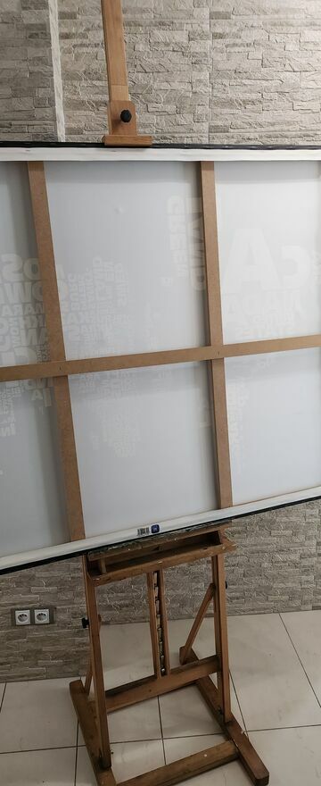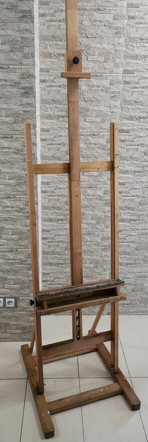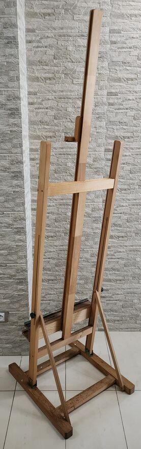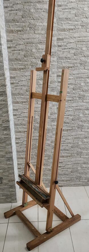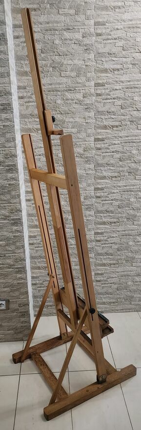 "ogłoszenie widoczne == AKTUALNE"Używana duża sztaluga studyjna malarska, ze śladami użytkowania ale bez pęknięć, złamań itp. Zamek i blokady sprawne. Stabilna. Na jednym ze zdjęć z ramą o wymiarach 150 x 120 cm.