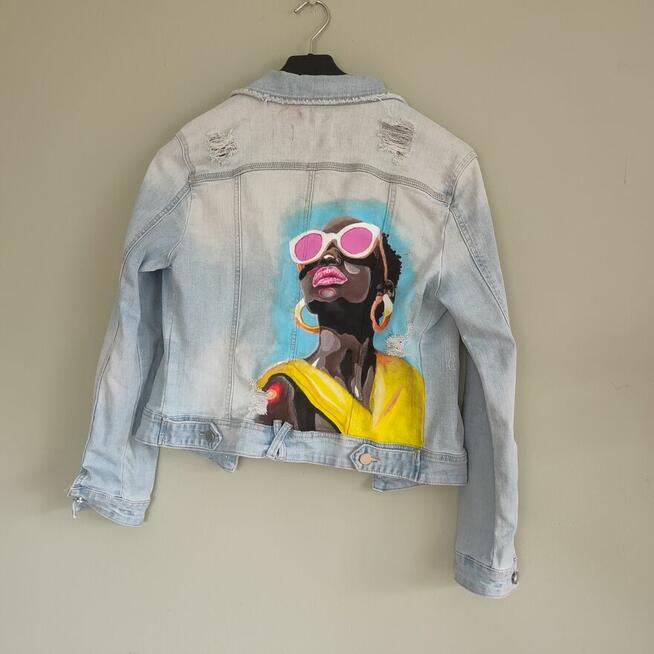 Unikatowa kurtka jeansowa handmade Ręcznie malowana kurtka jeansowa w jasnym odcieniu denimu, stworzona z pasją i ...