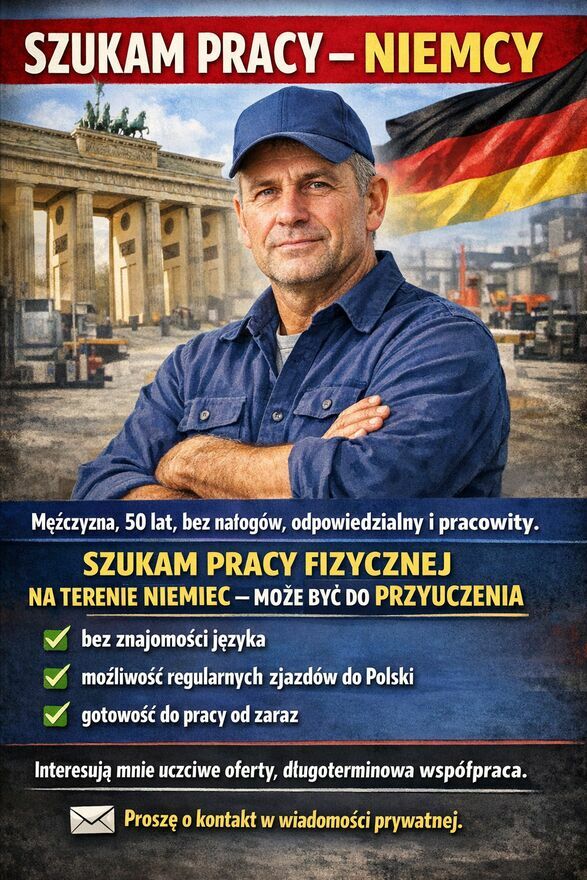 Mężczyzna lat 50 bez nałogów sprawny fizycznie szuka pracy na terenie Niemiec najlepiej Berlin Dresden lub inne miasta w bliskiej odległości granicznej. Może być też dalej z możliwością regularnych zjazdów do kraju . interesuje mnie praca fizyczna z zakwaterowaniem. Jeżeli chodzi o branże odpada murarka betony itp . Chętnie nauczę się czegoś nowego jeżeli nie będzie to problemem ponieważ szybko się uczę . Pozdrawiam i dziękuję za oferty.Maciej