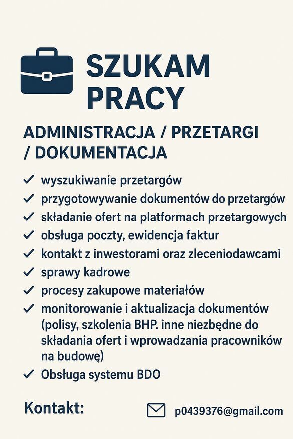 Szukam pracy / biuro, budowlanka ,przetargi, zamówienia publ