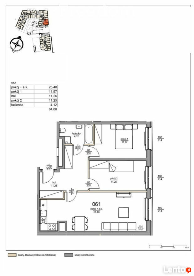 Mieszkanie o powierzchni 64,08 m2 usytuowane na parterze.