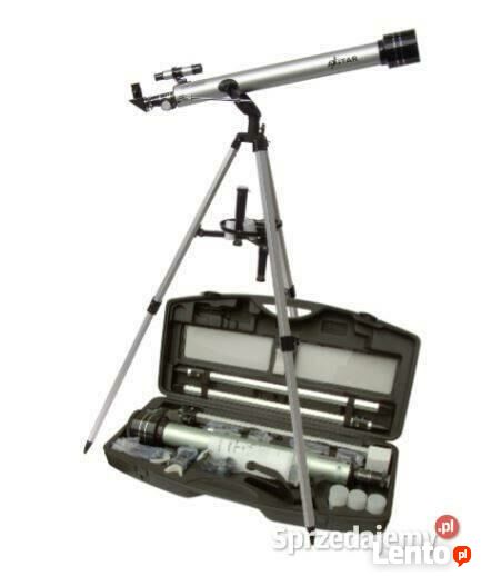Teleskop Astar Gemini 70060 TX to refraktor o średnicy 60 mm i ogniskowej wynoszącej 700 mm dostarczany z montażem azymutalnym, aluminiowym statywem i plastikową walizką. Wyciąg okularowy umożliwia wykorzystanie okularów średnicy 1,25 cala. W zestawie znajduje się celownik 5x24. Tubus zamocowano na montażu azymutalnym AZ2. Dane techniczne: średnica: 60 mm ogniskowa: 700 mm światłosiła (jasność): f/11.7 max. użyteczne powiększenie teleskopu* 142x min. użyteczne powiększenie teleskopu 12x graniczna wielkość gwiazdowa m= +11.39 mag* 25mm - 28x - +11,06 mag 12mm - 58x - +11,86 mag 6mm - 117x - +12,61 mag ilość zebranego światła 73 zdolność rozdzielcza (teoretyczna) 1,93"* waga ok 4 kg Uwaga: Parametry oznaczone *) są w znacznym stopniu szacunkowe i w jeszcze większym uzależnione od warunków pogodowych. Typowe maksymalne powiększenie, przy dobrych warunkach obserwacji, mieścić się będzie w granicach 120 ÷ 142×. W zestawie: okular SR 4 mm (1,25") okular H 12,5 mm (1,25") okular H 20 mm (1,25") odwracacz obrazu x1,5 lunetka celownicza 5x24 soczewka Barlow'a x3 statyw aluminiowy montaż azymutalny plastikowa walizka do przechowywania Uszkodzony wewnętrzny element plastikowy w metalowej górnej części statywu. Nie uniemożliwia złożenia > pokazane na ostatnim zdjęciu. Element ten wchodzi w tą trójkątną część statywu pokazaną obok. Zapakowane razem w białą torebkę.Sprawdź zainteresowanie tym ogłoszeniem