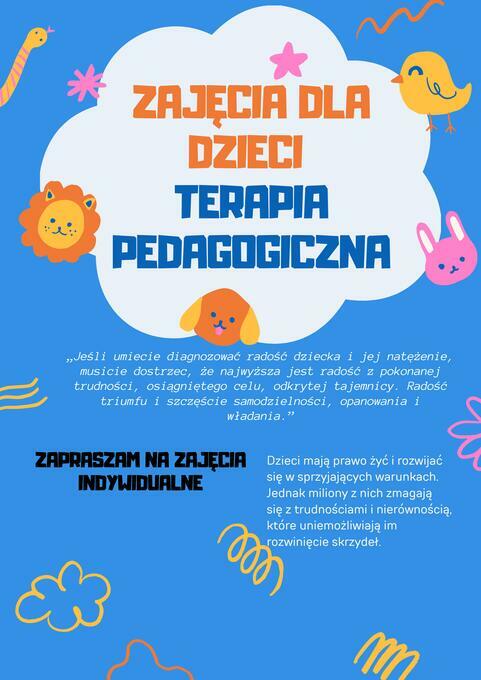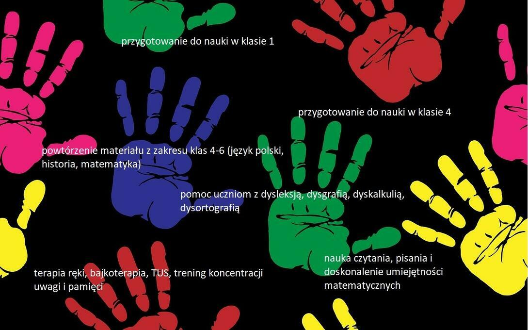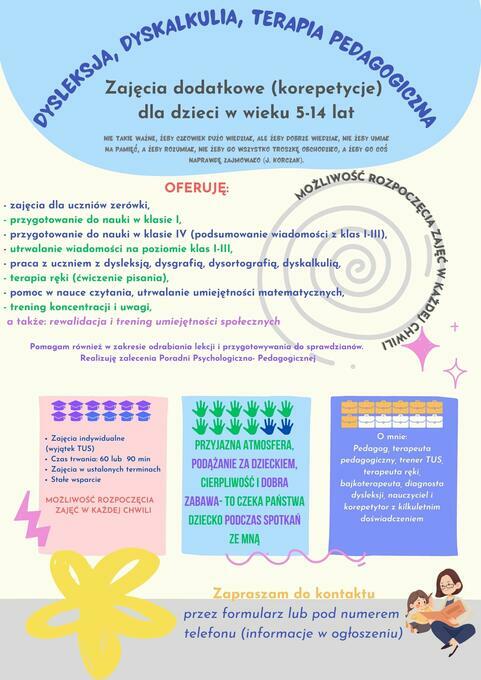 Zapraszam na zajęcia korekcyjno-kompensacyjne (terapia pedagogiczna - wsparcie dla uczniów z dysleksją, dysgrafią, dyskalkulią), terapię ręki, trening umiejętności społecznej, rewalidację.