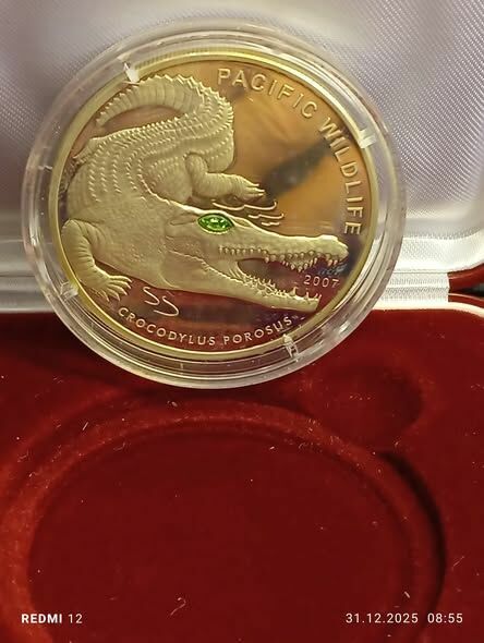 o nominale 5 dolarów, wybitą w 2007 roku a przedstawiającą krokodyla, który w oku ma kamień Swarovskiego. Moneta umieszczona w kapsule ochronnej jest w bardzo dobrym stanie.