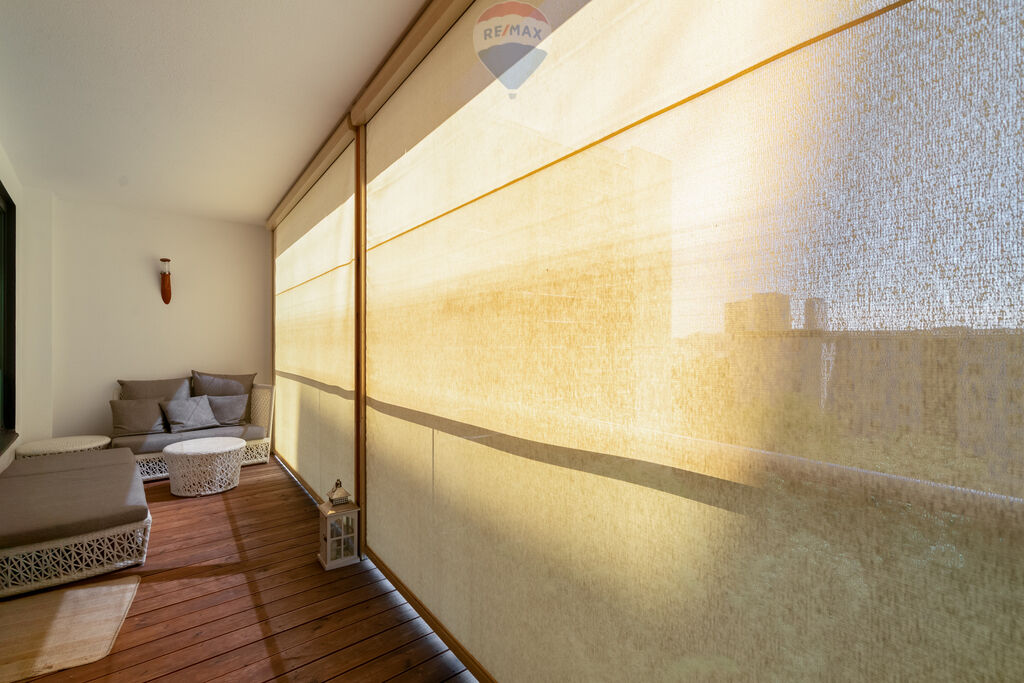 Dwie jasne rolety zewnętrzne typu screen, stanowiące doskonałą