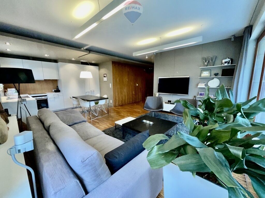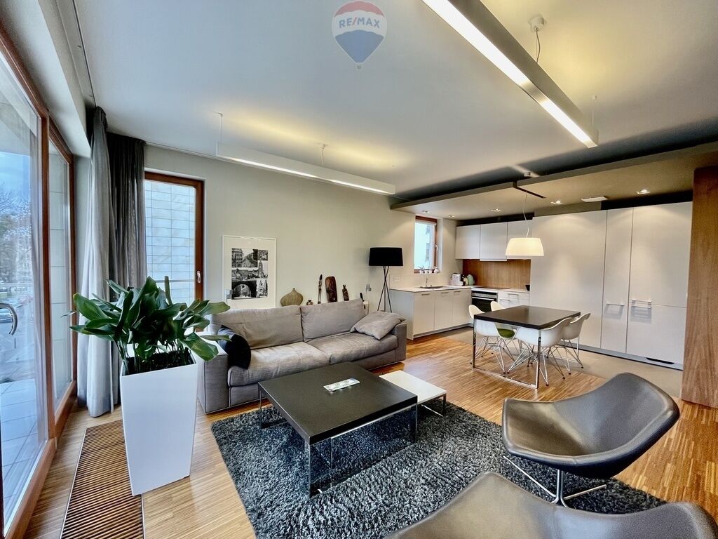 salon moderne avec accès à une grande terrasse et une cuisine en