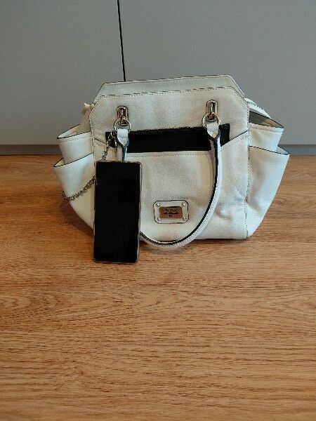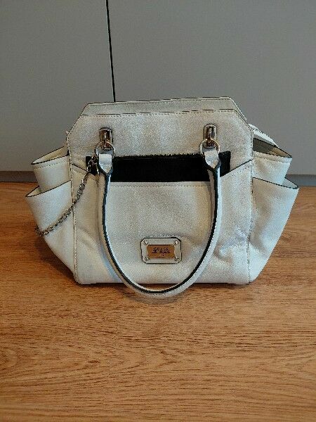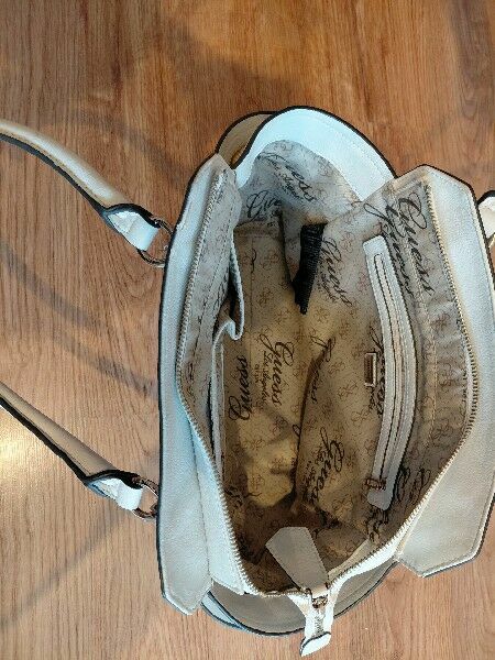 Sprzedam damską torebkę marki Guess w jasnym kolorze.Model elegancki i pojemny, idealny do codziennego użytku. Torebka ma usztywniony fason, metalowe detale i charakterystyczną, logowaną podszewkę.