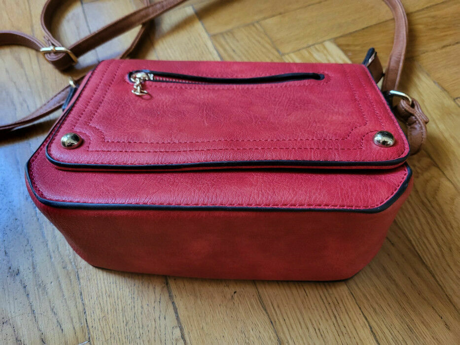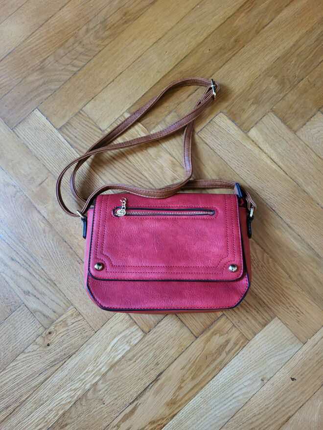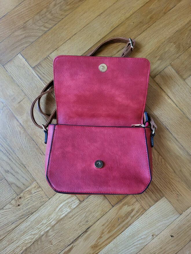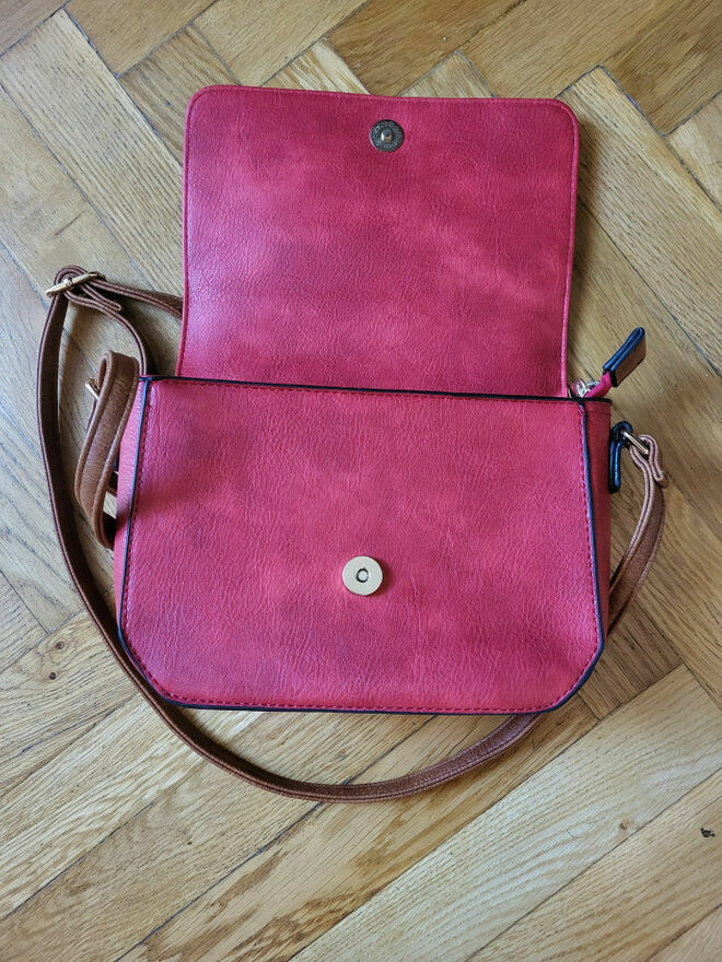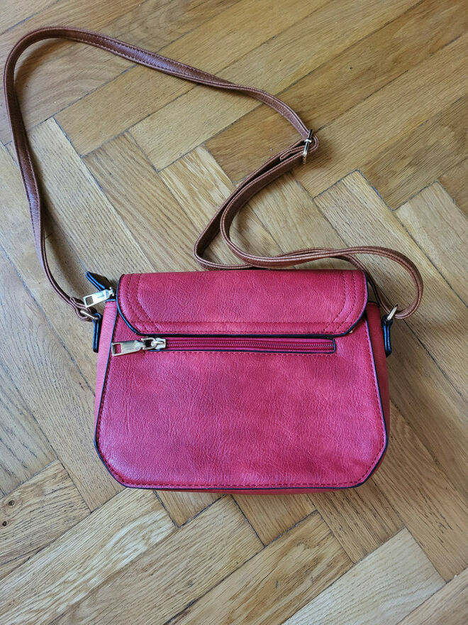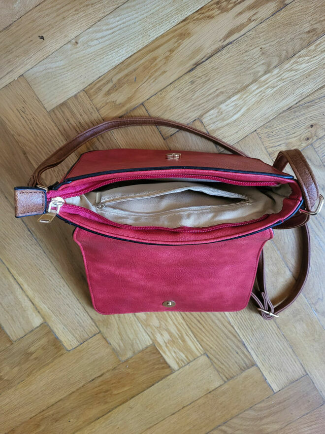 Torebka listonoszka Czerwona - Stan BDB.Z tyłu kieszonka zapinana na zamek, na klapce też kieszonka zapinana na zamek, w środku dodatkowa kieszonka zapinana na zamek, oraz cały środek też zapinany.