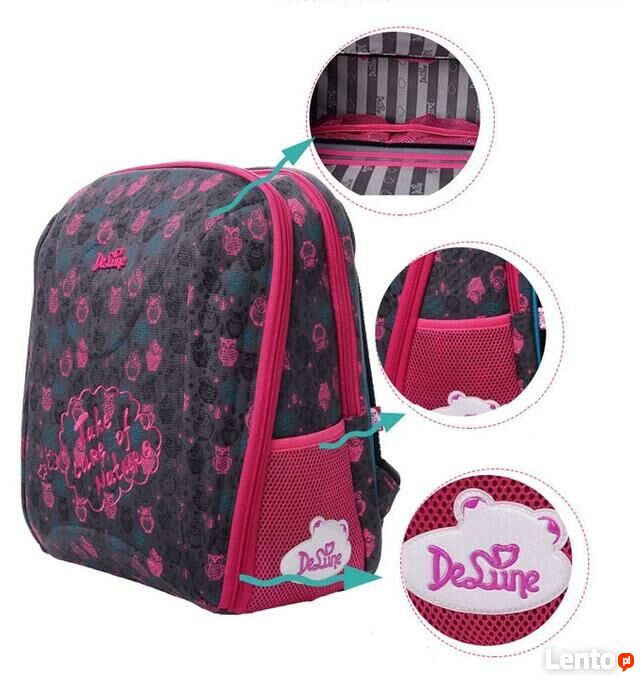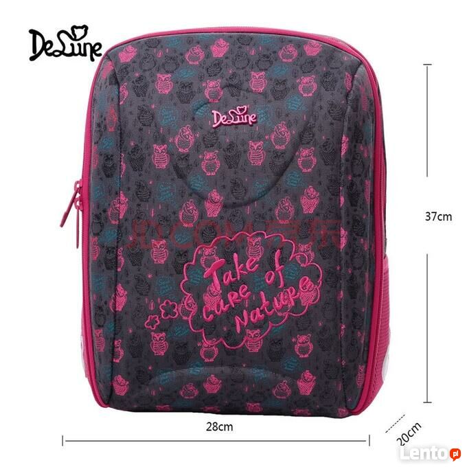Funkcjonalny i ładny, w stonowanych barwach tornister dla dziewczynki, z wyhaftowanym na tle nadruku sówek przesłaniem dla świata - dbajmy o naturę - take care of nature.Jest to dwukomorowy tornister/plecak dla uczniów szkoły podstawowej.