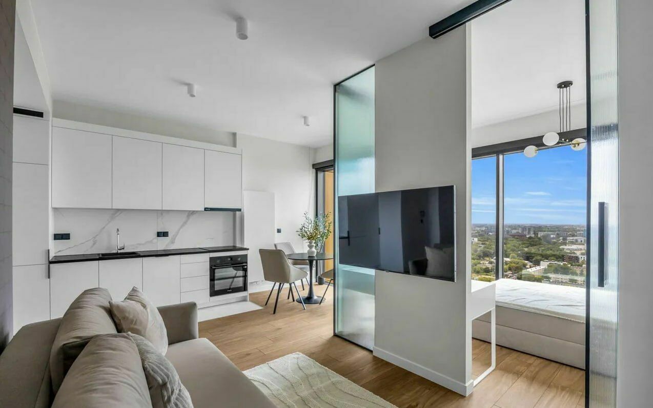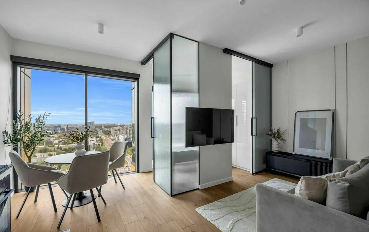 Mieszkanie położone jest na wysokim piętrze i oferuje widok na centrum Warszawy. Lokal jest w pełni umeblowany, wykończony w nowoczesnym standardzie i gotowy do zamieszkania.