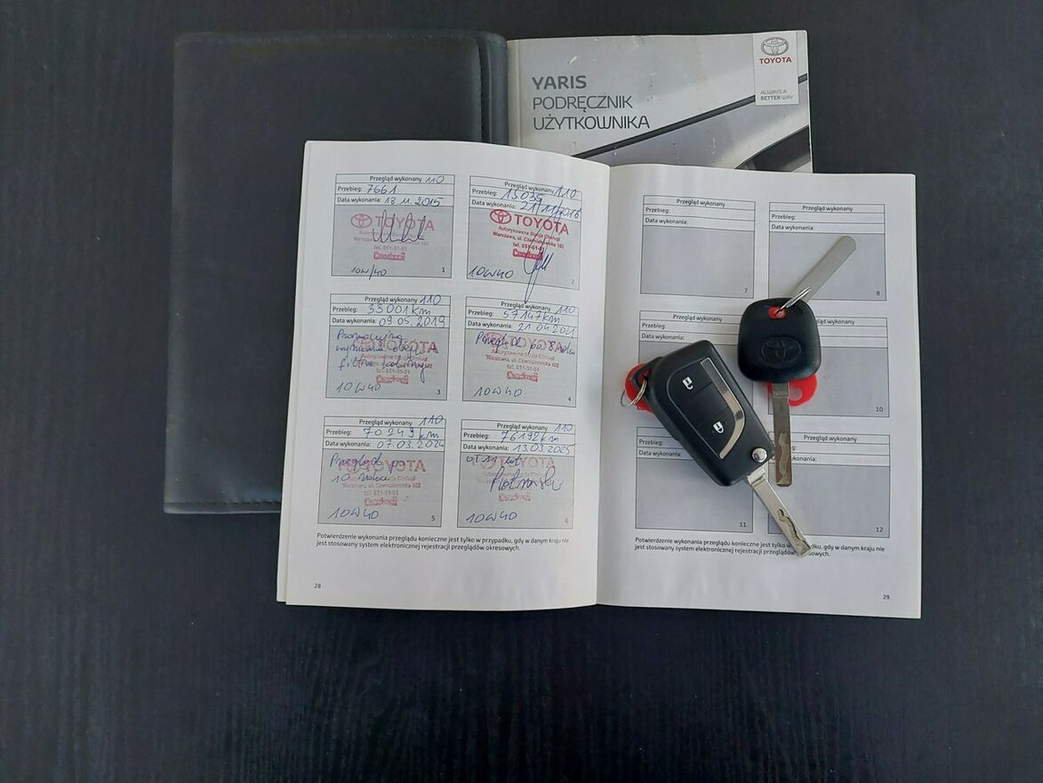 - ostatni przegląd serwisowy w ASO Toyoty wykonano 13 marca 2025, przy przebiegu 76 tys. km.