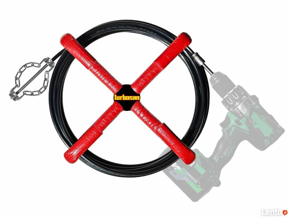 Zestaw Turbsan został zaprojektowany do obrotowego czyszczenia rur kanalizacyjnych, odpływów ze zlewów, odpływów z toalet itp.
