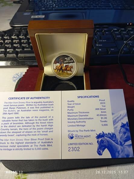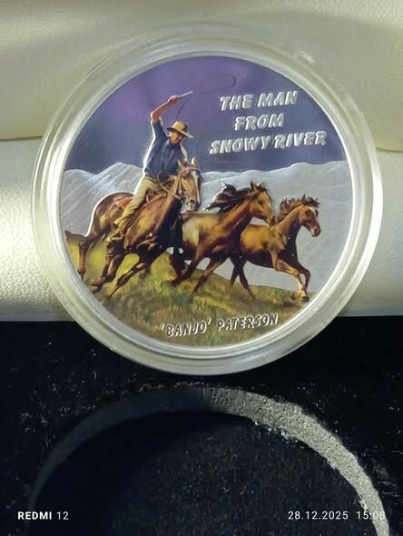 CENA 350 ZŁ + kw - blik lub na kontoCZŁOWIEK ZE ŚNIEŻNEJ RZEKI Banjo Paterson Srebrna moneta 1$ Tuvalu 2010