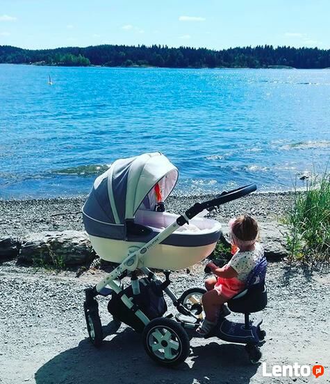 Uniwersalna Easy X Rider v2 to dostawka 2w1 może być dostawką siedzącą, jak i stojącą. Dzięki uniwersalnemu teleskopowemu stelażowi i elastycznemu mocowaniu, pasuje do wszystkich modeli wózków, zarówno parasolek jak i 2w1. Easy X Rider montuje się na pionowych belkach idących od tylnich kół wózka. Składa się: z wygodnego siedziska z 3 punktowymi pasami, z jednej wybranej z 15 wzorów miękkiej poduszki, z antypoślizgowej platformy, świecących amortyzowanych kółek, adapterów oraz paska dzięki któremu możemy podnieść całość.Przeznaczona dla dzieci od 15 miesiąca życia i ważących maksymalnie 25 kg.