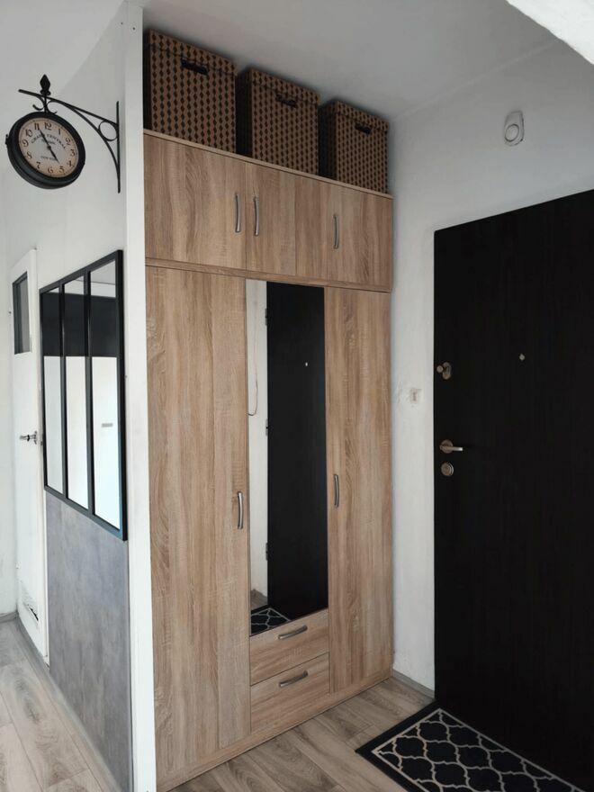 - Przedpokój 9,5 m² z dwoma szafami. Na wyposażeniu odkurzacz, mop i suszarka na pranie.