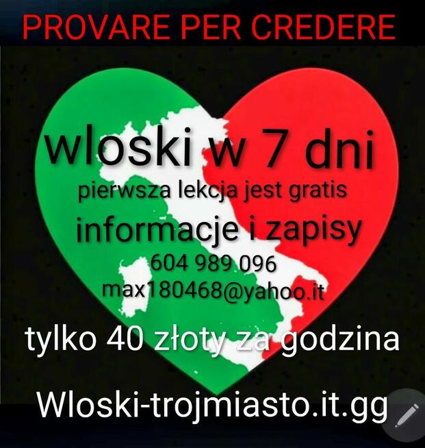 WLOSKI W 7 DNI Witam, zapraszam was na moje lekcje wloskiego, tylko 40 zloty za godzina, pierwsza lekcja jest gratis. 604 ...