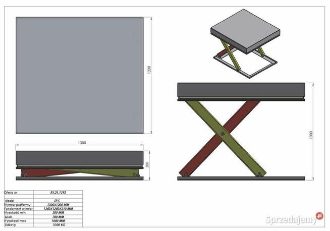 Podnośnik nożycowy firmy HYDROMECHANIKA R.M. udźwig 1000 kg wymiar blatu 1300 x 1200 mm wysokość max 1000 ...