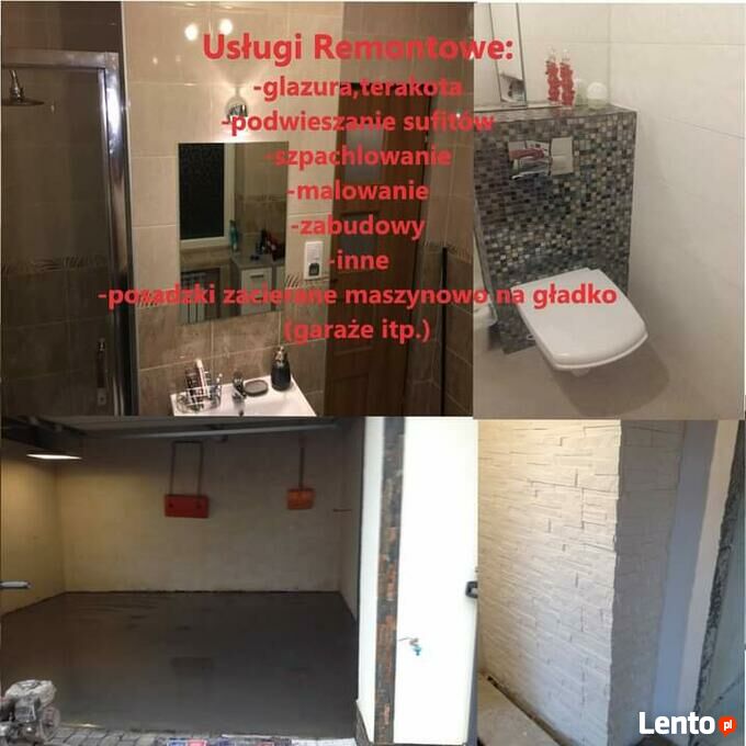 Usługi remontowe- tynki(agregatem ) Wykonuje remonty :domów,mieszkań itp. -Łazienki -glazura ,terakota ,gres -Szpachlowanie -malowanie -układanie podłóg -zabudowy (ścianki ,sufity) -tynki...Sprawdź zainteresowanie tym ogłoszeniem