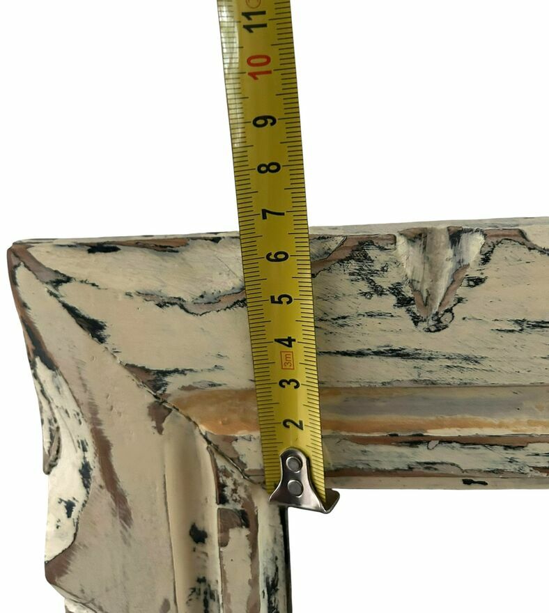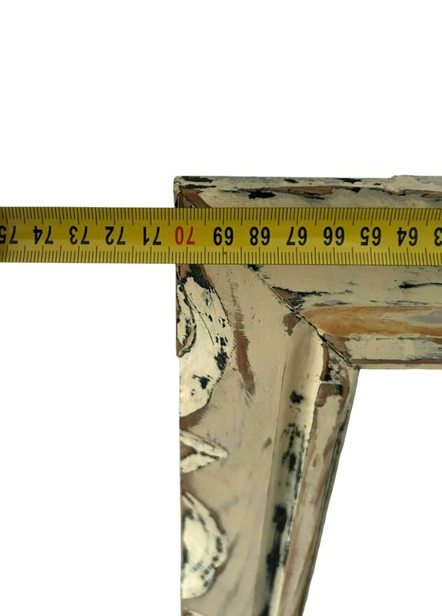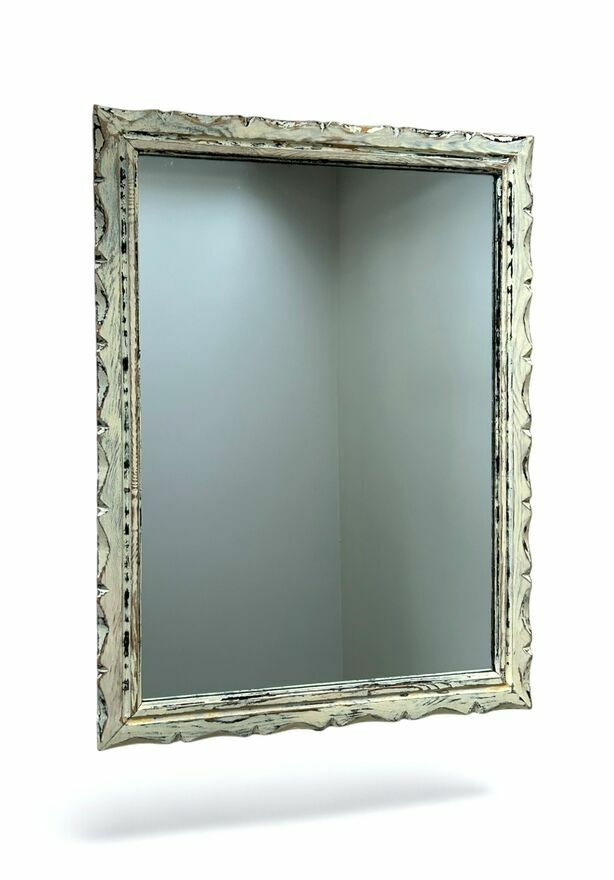 Sprzedam duże, masywne lustro z litego drewna z okresu PRL, wykonane w stylu ludowym / rustykalnym. Rama zdobiona dekoracyjnym frezem o półkolistym motywie, charakterystycznym dla wyrobów inspirowanych rzemiosłem regionalnym.Wymiary z ramą: 94 x 70 cm. Lustro jest ciężkie i solidne, w bardzo dobrym stanie – tafla bez pęknięć, rys i zniekształceń. Rama została odświeżona w stylu shabby chic z delikatnymi przecierkami, co podkreśla jej charakter vintage.