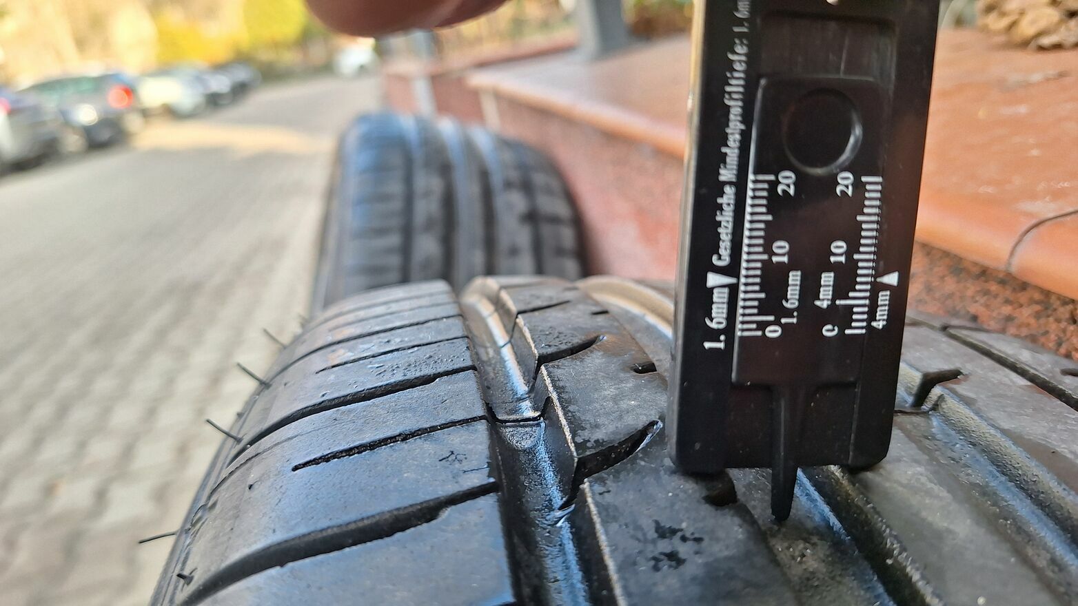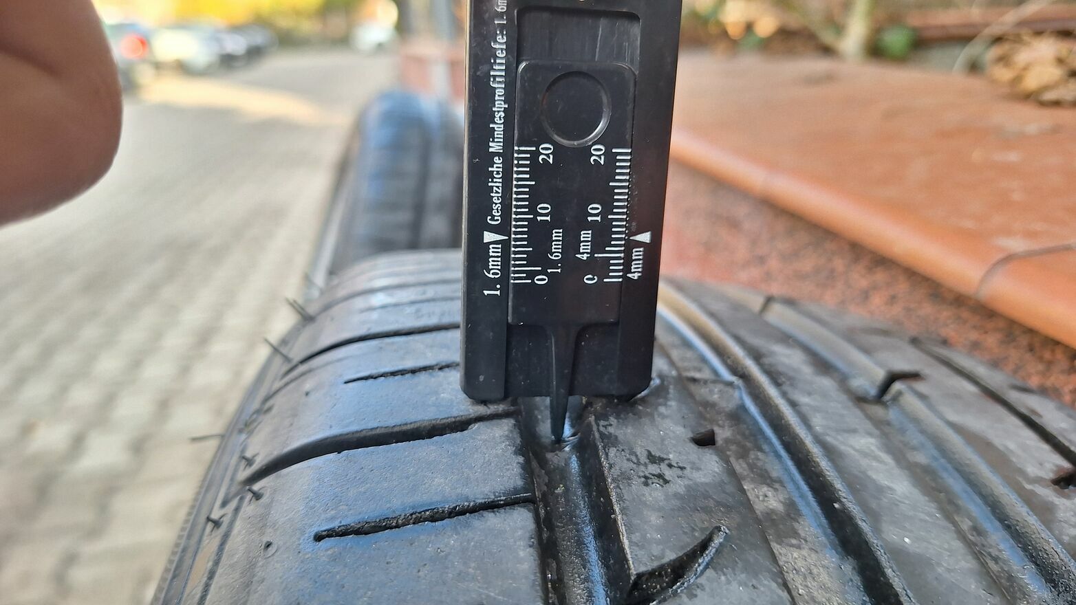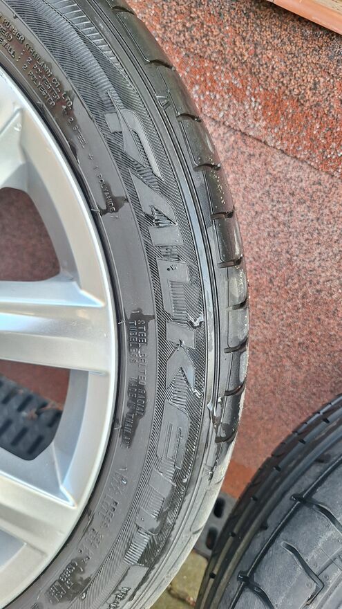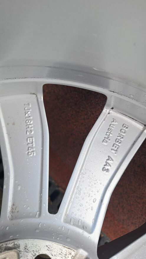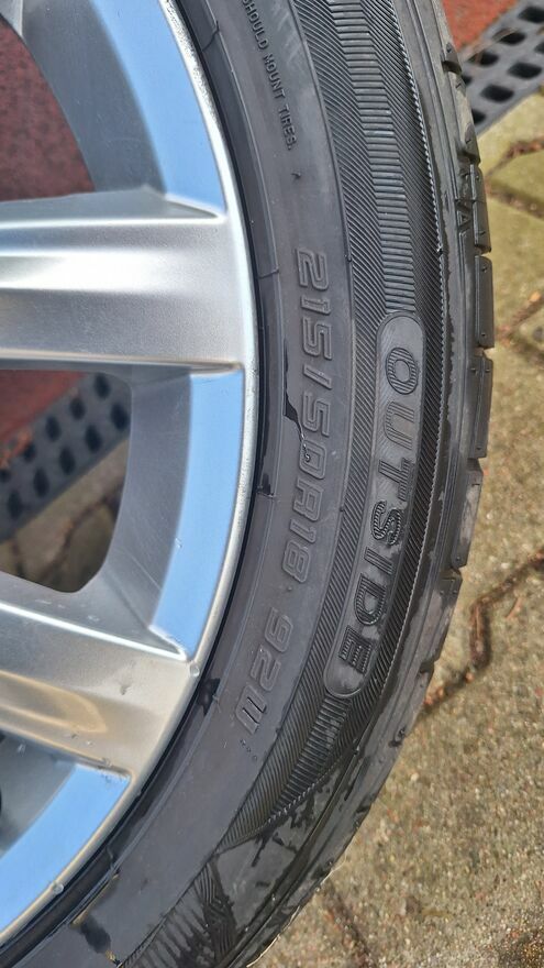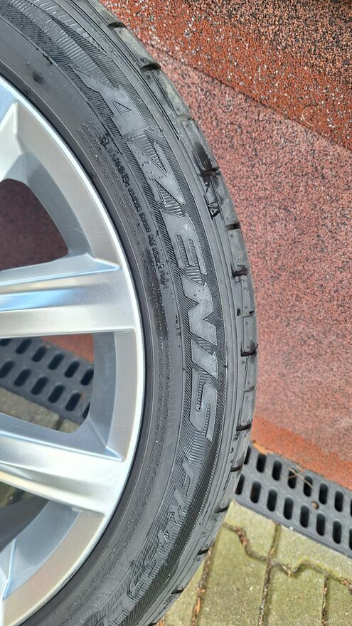 Oryginalne felgi VW 7Jx 18H2 ET 45, otwory na śruby 5 X 112 opony 215/50/18 letnie FALKEN AZENIS, bardzo ciche - ocena A i na deszcz ocena A. Po dwóch sezonach letnich z bieżnikiem jak widać na zdjęciu 7 mm. Samochód VW T- ROC, bardzo mało jeździł, sprzedany na zimowym zestawie.Pasują na PSSATA B6, B7, B8 i TIGUANA pierwsza i druga generacja.