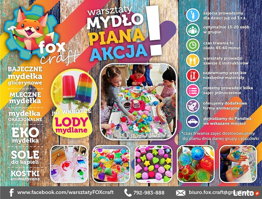 Zapraszamy do skorzystania z naszej oferty prowadzenia WARSZTATÓW MYDLARSKICHPodczas warsztatów dzieci samodzielnie wykonują swoje mydełka nadając im odpowiedni kształt, kolor zapach czy fakturę zatapiając w nim różnorodne, kolorowe dodatki. Wspólnie na koniec zapakujemy estetycznie nasze mydełka i każdy będzie mógł je zabrać ze sobą do domu.