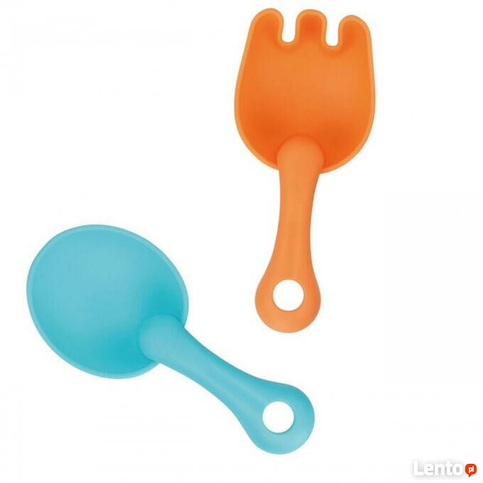 Plastikowe są również grabki i łopatka. W zestawie także foremki do piasku.
