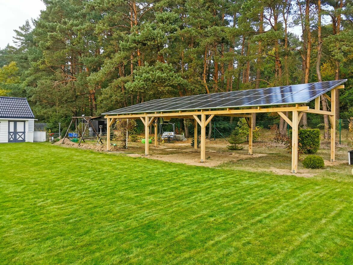 Wiata fotowoltaiczna z magazynem energii – drewno KVH
