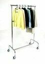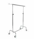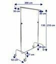 STOJAK wieszak metalowy na ubrania 140/200x130/210x52 cm na kółkach z hamulcami, z regulowaną szerokością górnego drążka i regulowaną wysokością całego stojaka - CAŁY CHROMOWANY. Boki stojaka w całości, konstrukcja spawana.Udźwig 120 kg.