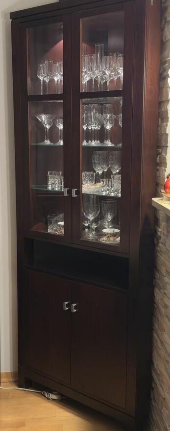 Stylowy kredens narożny w kolorze wenge . z Oświetleniem. Posiada przeszklone drzwiczki, w których można eksponować szkło i porcelanę. Dolna część kredensu to zamykane szafki. Mebel jest w bardzo dobrym stanie, Wymiary: 212x85x40cm.Odbiór w Warszawie na Bemowie