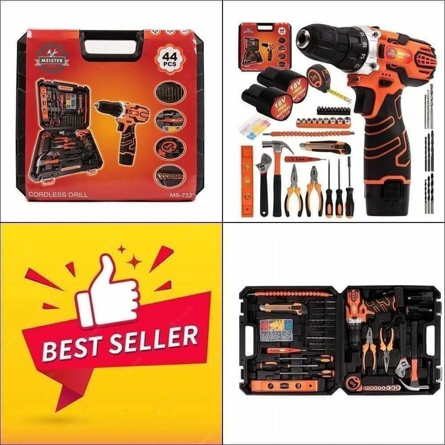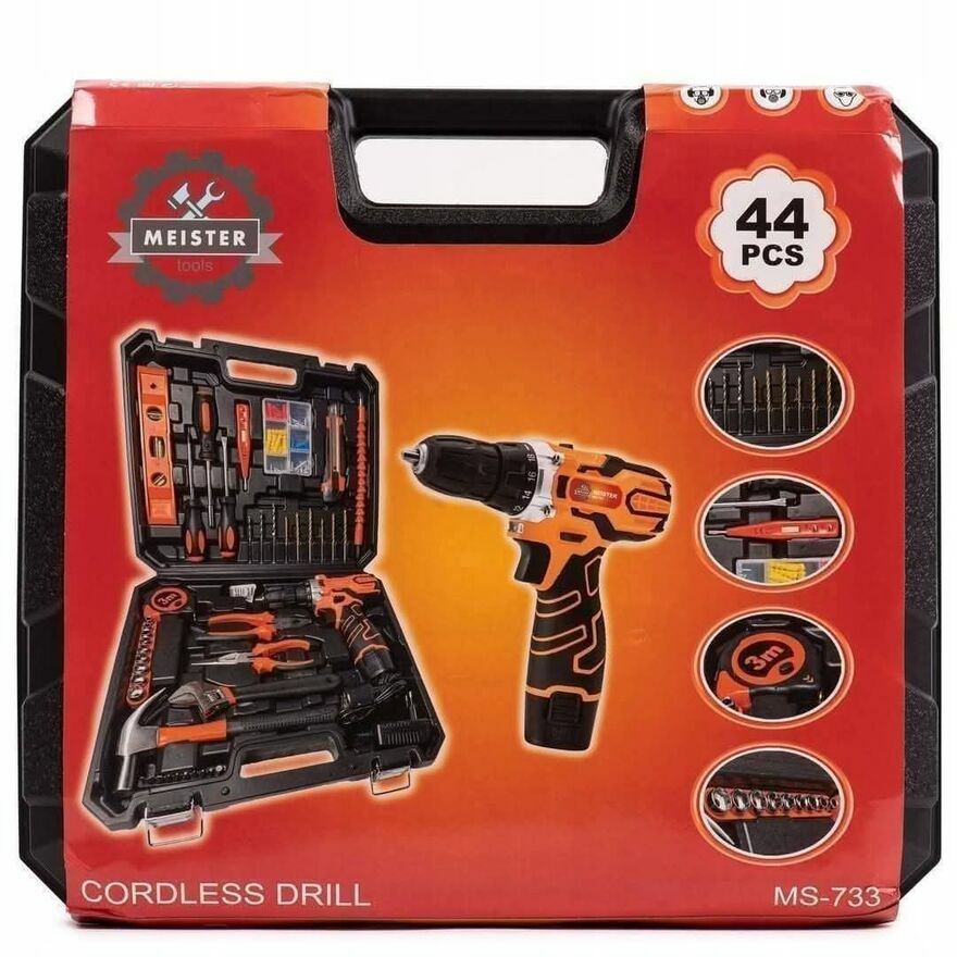 W ofercie fabrycznie nowy produkt, WKRĘTARKA AKUMULATOROWA MEISTER 2 AKU + 44 ELEMENTY W WALIZCEWiertarko-wkrętarka 18 V dostarczana z dwoma akumulatorami.