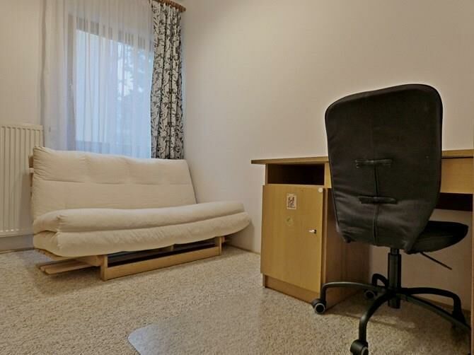 Pokój: kanapa rozkładana, biurko + krzesło, meblościanka.