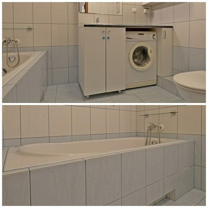 Łazienka: wanna, pralka, WC, umywalka.