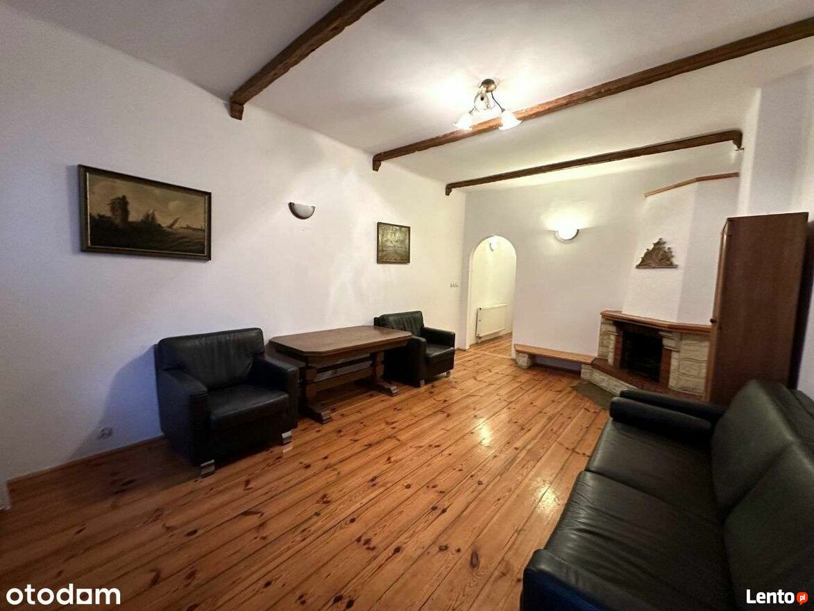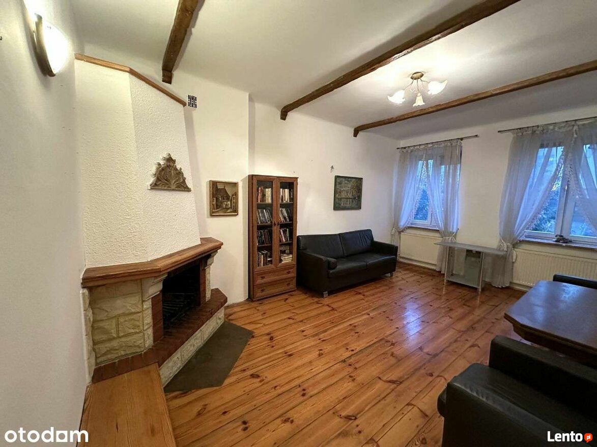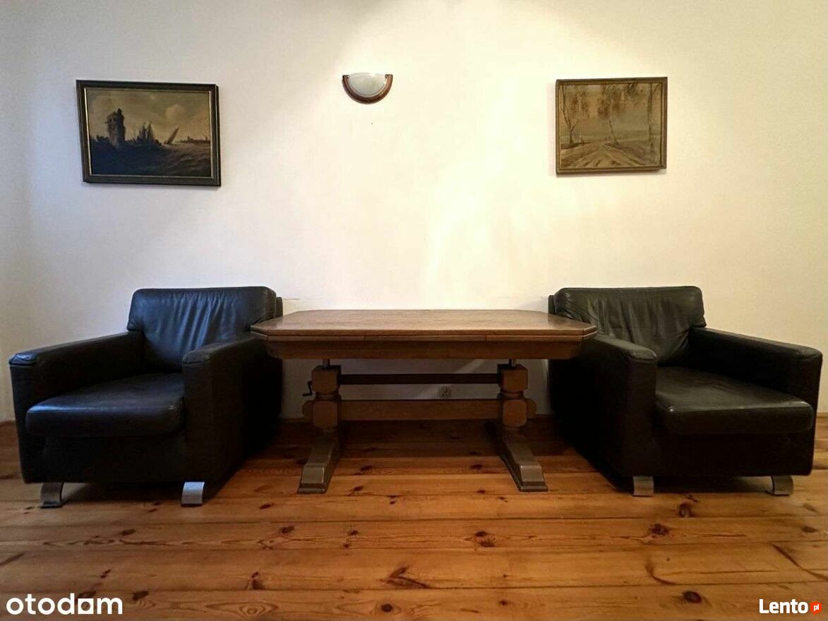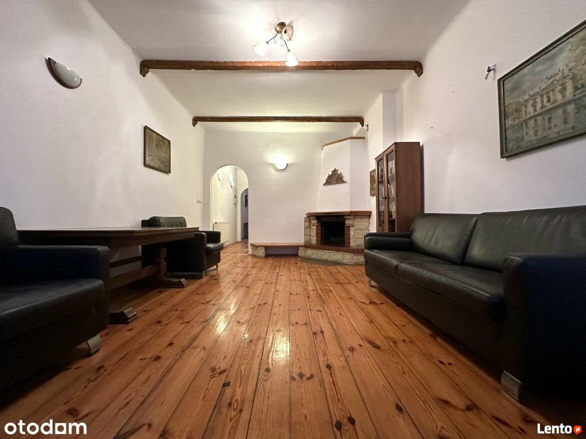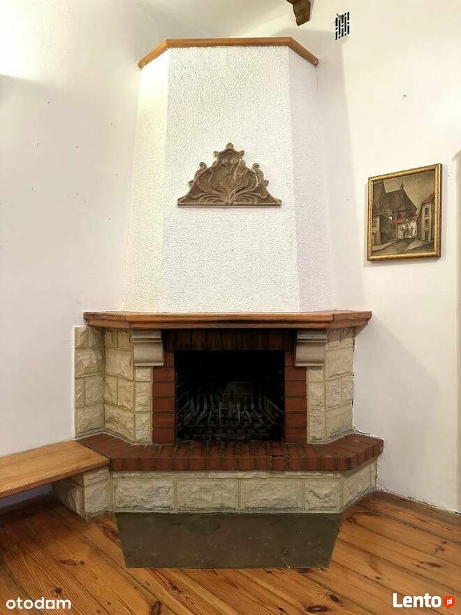 Salon: W przestronnym salonie znajduje się kominek, który zimą tworzy niezapomniany klimat. Podłogę zdobi gruba, wieloletnia deska, której wartość jest znaczna. Zestaw wypoczynkowy z prawdziwej skóry (warty 20 000 zł), mało używany, oraz ręcznie wykonana dębowa ława vintage z możliwością regulacji szerokości i długości, dodają pomieszczeniu wyjątkowego charakteru.