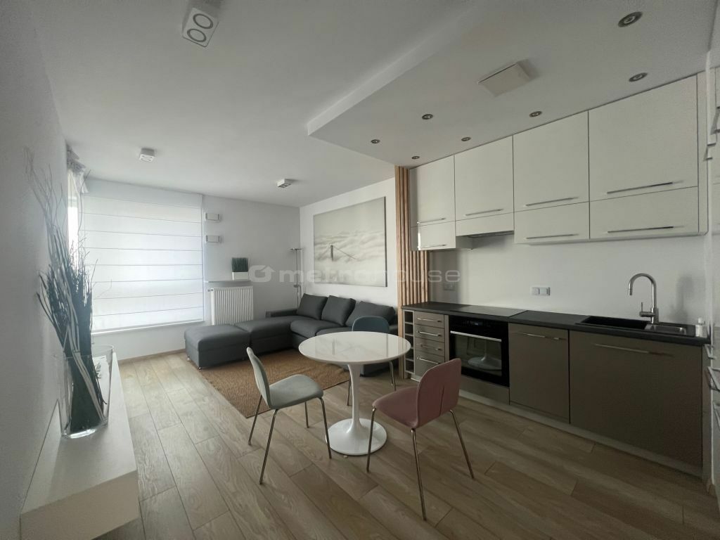 Nieruchomość została zaprojektowana z myślą o wygodzie i funkcjonalności. Składa się z przestronnego salonu z aneksem kuchennym, który tworzy jasną i przyjazną przestrzeń do codziennego życia. Kuchnia w eleganckiej biało-szarej zabudowie została w pełni wyposażona w niezbędny sprzęt AGD: zmywarkę, piekarnik, lodówkę oraz wyciąg.