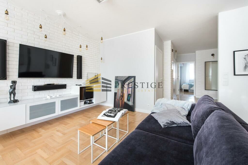 rozpościera się widok na nowoczesny skyline Warszawy. Salon