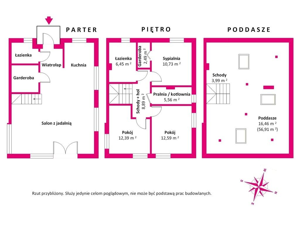 pomieszczeń obejmuje trzy kondygnacje ( parter, piętro oraz