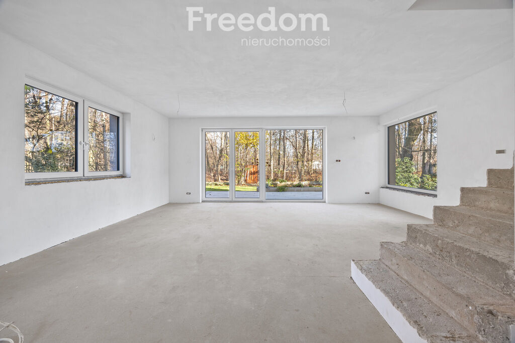 Duże przeszklenia z widokiem na las, w tym drzwi tarasowe prowadzące
