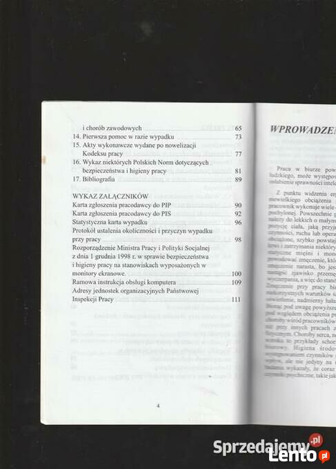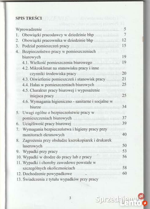 SPIS TREŚCI DZENIE Wprowadzenie Obowiązki pracodawcy w dziedzinie bhp 2. Obowiązki pracownika w dziedzinie bhp 3. Podział pomieszczeń pracy Bezpieczeństwo pracy w pomieszczeniach biurowych 4.1. Wielkość pomieszczenia biurowego. 00 4.2. Mikroklimat na stanowisku pracy i inne goctylo czynniki środowiska pracy 4.3. Oświetlenie pomieszczeń i stanowisk pracy 4.4. Hałas w pomieszczeniach biurowych 80-4.5. Charakter pracy biurowej i wyposażenie miejsca pracy 4.6. Wymagania higieniczno - sanitarne i socjalne w biurze Uwagi ogólne o bezpieczeństwie pracy w 90 pomieszczeniach biurowych Uciążliwość pracy biurowej Wymagania bezpieczeństwa i higieny pracy przy monitorach ekranowych Zagrożenia przy obsłudze kserokopiarek i drukarek laserowych Wypadki przy pracy Wypadki w drodze do pracy lub z pracy. Wypadki i choroby zawodowe powstałe w szczególnych okolicznościach Dochodzenie powypadkowe Świadczenia z tytułu wypadków przy pracy Pierwsza pomoc w razie wypadku Akty wykonawcze wydane po nowelizacji sinos Kodeksu pracy did.sini harsh bezpieczeństwa i higieny pracy. Bibliografia dosision Wykaz niektórych Polskich Norm dotyczących Praca w biurze pow ludzkiego, może występow osłabienie sprawności intele WYKAZ ZAŁĄCZNIKÓW Karta zgłoszenia pracodawcy do PIP sa temiblo Karta zgłoszenia pracodawcy do PIS Statystyczna karta wypadku Karton 91 Ogłoszenie jest aktualne dopóki znajduje się na stronie . Odbiór osobisty lub wysyłkaSprawdź zainteresowanie tym ogłoszeniem