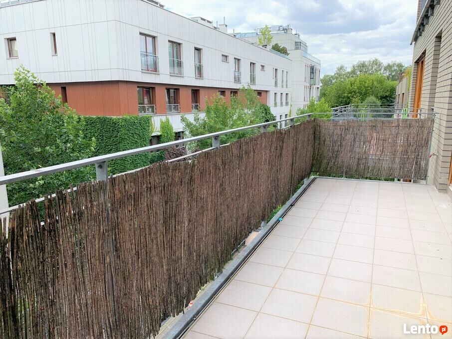 Okna/drzwi balkonowe wychodzą na stronę świata, przez które można wyjść na duży taras o powierzchni ok. 10 m².