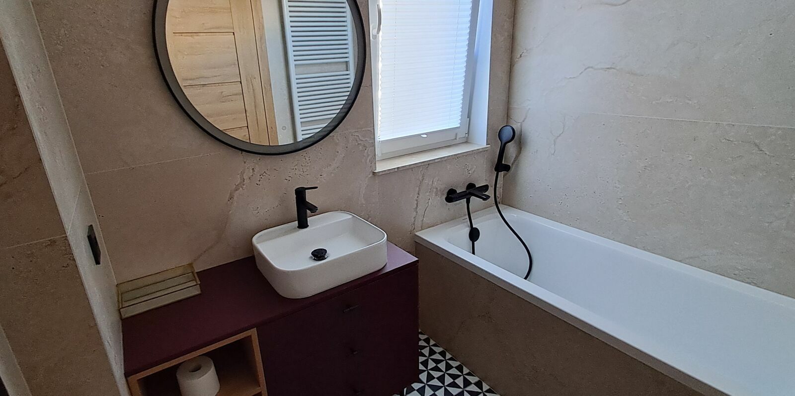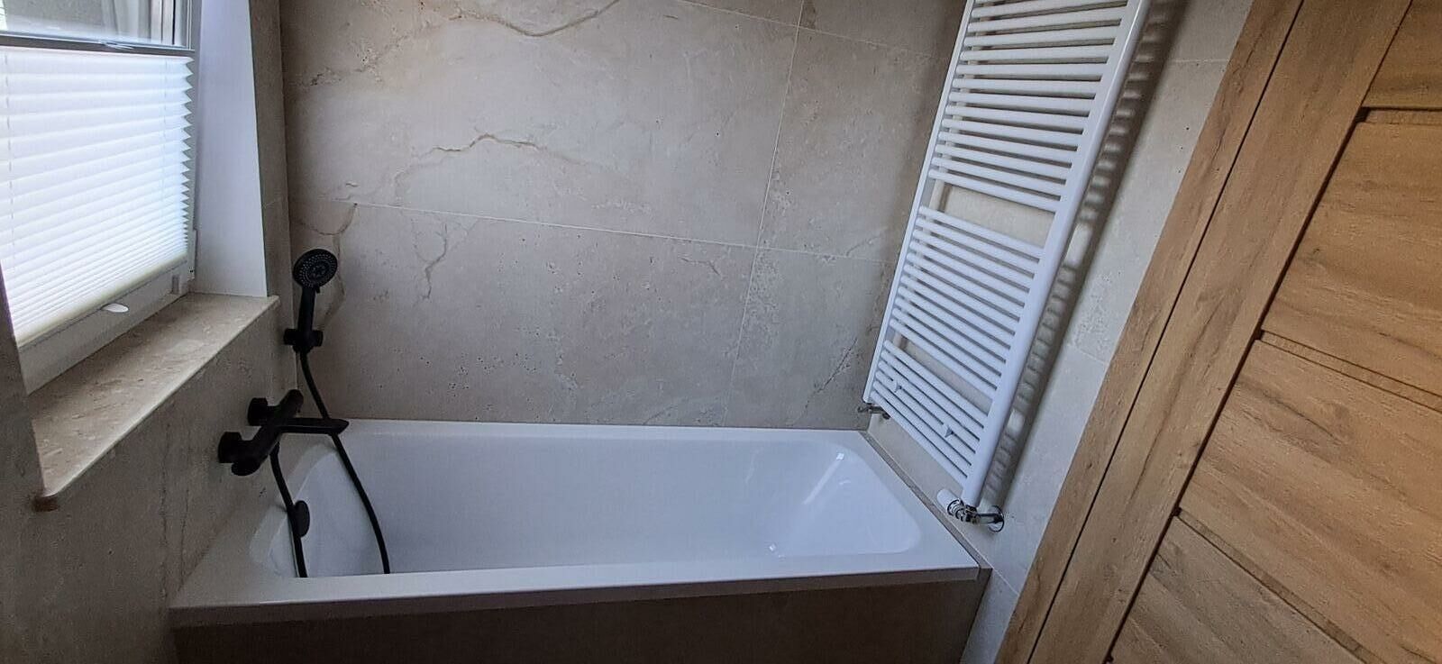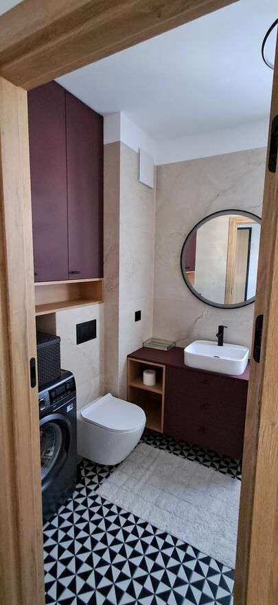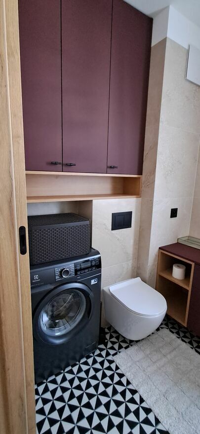 • łazienka z wanną i pralką,