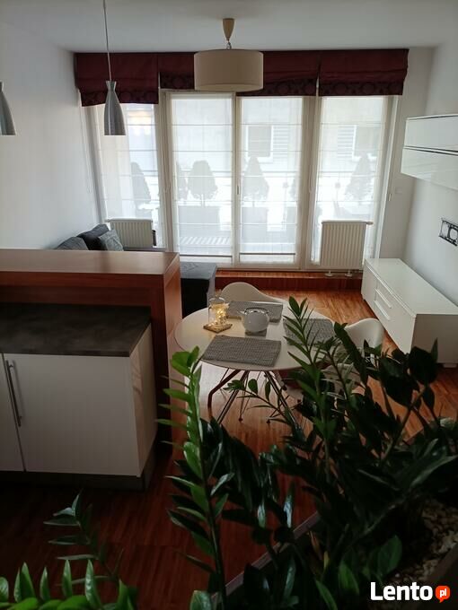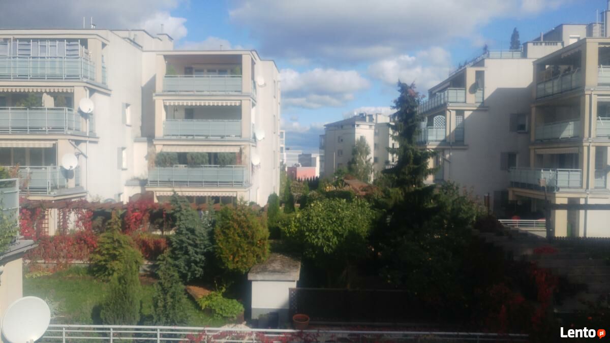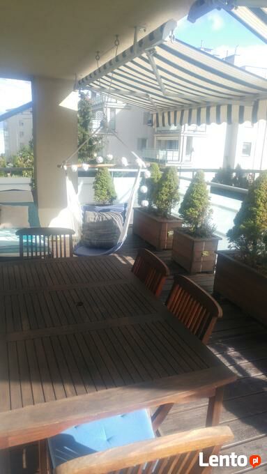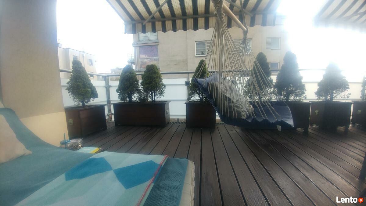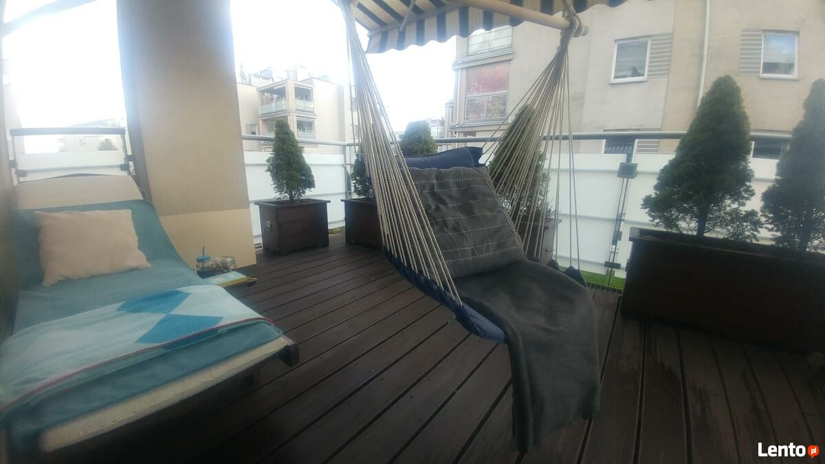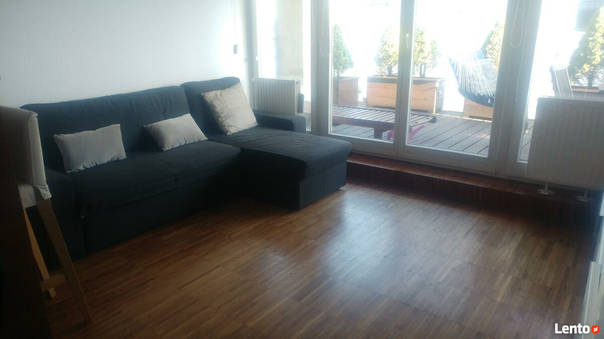 Wynajmę piękne mieszkanie 2 pokojowe z dużym tarasem na zamkniętym osiedlu.Mieszkanie o powierzchni 42,5 mkw składa się z holu dzielącego wejście od części dziennej wysoką wbudowaną donicą w której mamy przestrzeń z wbudowanymi szafkami na buty i tuż obok miejsce na kurtki. Kuchnia w formie widnego, przestronnego aneksu kuchennego otwartego na salon. Okna w kuchni wychodzą na wschód a w salonie na południe. Naturalnym przedłużeniem salonu jest ponad 20 metrowy taras wykończony naturalnym drewnem. Zaaranżowana zieleń zapewnia większą intymność oraz dodaje przyjemnego uroku. Umeblowany jest w leżankę, stół oraz 4 krzesła z drewna egzotycznego. Taras optycznie sprawia, że mieszkanie jest większe. Można otworzyć 2 drzwi okiennych. Cała południowa część salonu przeszklona, co zapewne cudowne nasłonecznienie i przyjemną energię w ciągu dnia. Na tarasie pijąc poranną kawę budzi nas przyjemnie wschodzące słońce, a popołudniu nagrzewa zachodzące. Sypialnia sąsiaduje z pokojem i pozwala na wyjście na taras. Okna od podłogi do sufitu zapewniają dużo światła. Zabudowa szaf i regałów do sufitu zaprojektowana indywidualnie pozwala na wykorzystanie każdego centymetra. Ogólną przestrzeń powiększają przesuwne podwójne drzwi, w momencie otwarcia sprawiają że przestrzeń wydaje się większa. Sypialnia wykończona jest wykładziną, a część salonu, kuchni oraz łazienki teakiem egzotycznym.