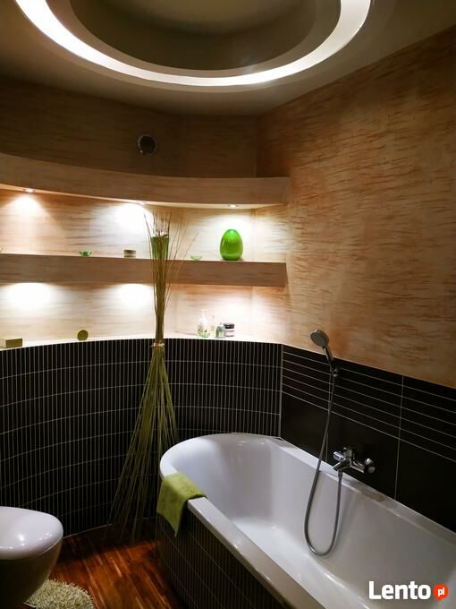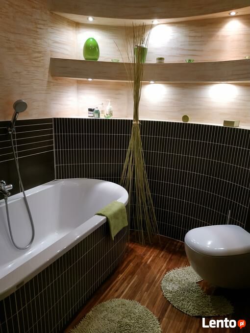 Łazienka to prawdziwe kobiece SPA. Zamiana dodatków może łatwo zmienić klimat czy kolorystykę. W propozycji na zdjęciu dodatki w soczystej relaksującej zieleni. Pasować jednak będzie każdy kolor. Ściany pokryte specjalną gładzią typu trawertyn (inspirowane) oraz terakotą. Zabudowa na pralkę oraz pojemne, głębokie szafki pozwala na schowanie dużej ilości ręczników, kosmetyków tak by nie zalegały na wierzchu, choć miejsce pozwala na dowolną aranżację. Ceramika marki Koło (wanna oraz umywalka, baterie Grohe, pralka Candy). Zabudowa w łazience z drewna. Duża i wygodna wanna idealna nawet dla 2 osób.