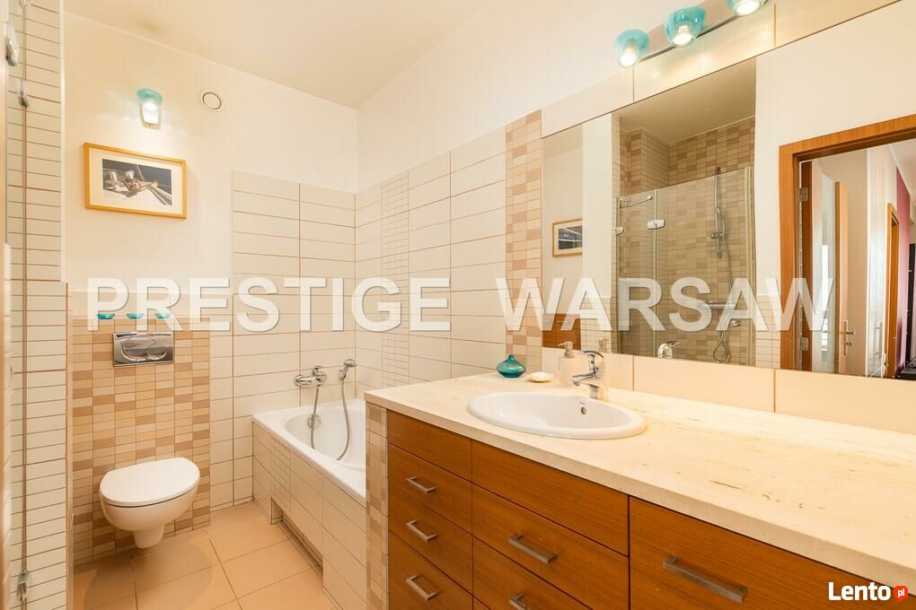 Łazienka: klasyczna wanna, wygodny prysznic, geberit, duża szafka z umywalką, kamienny blat, pralka ukryta w szafce, dodatkowa szafka.